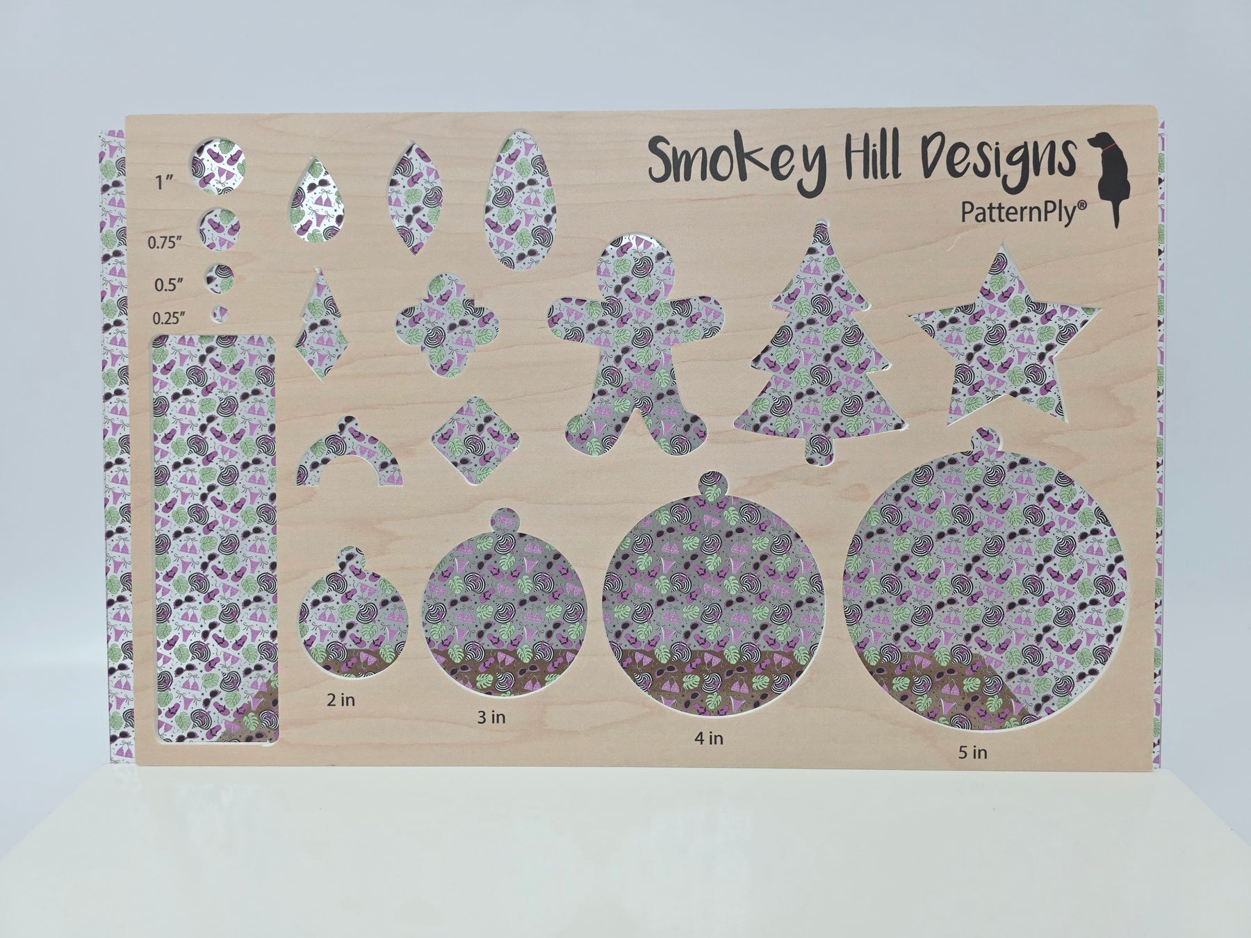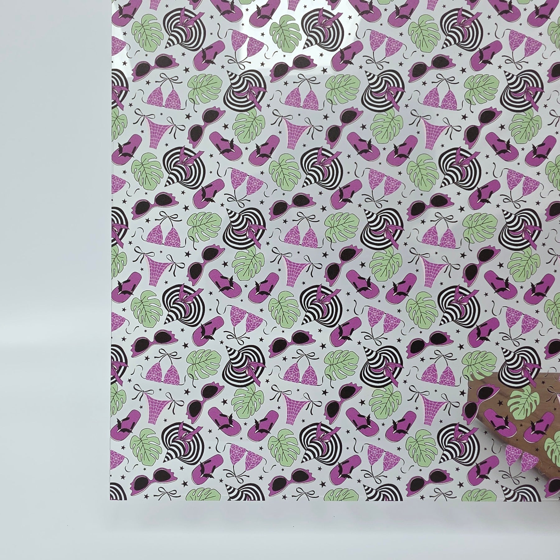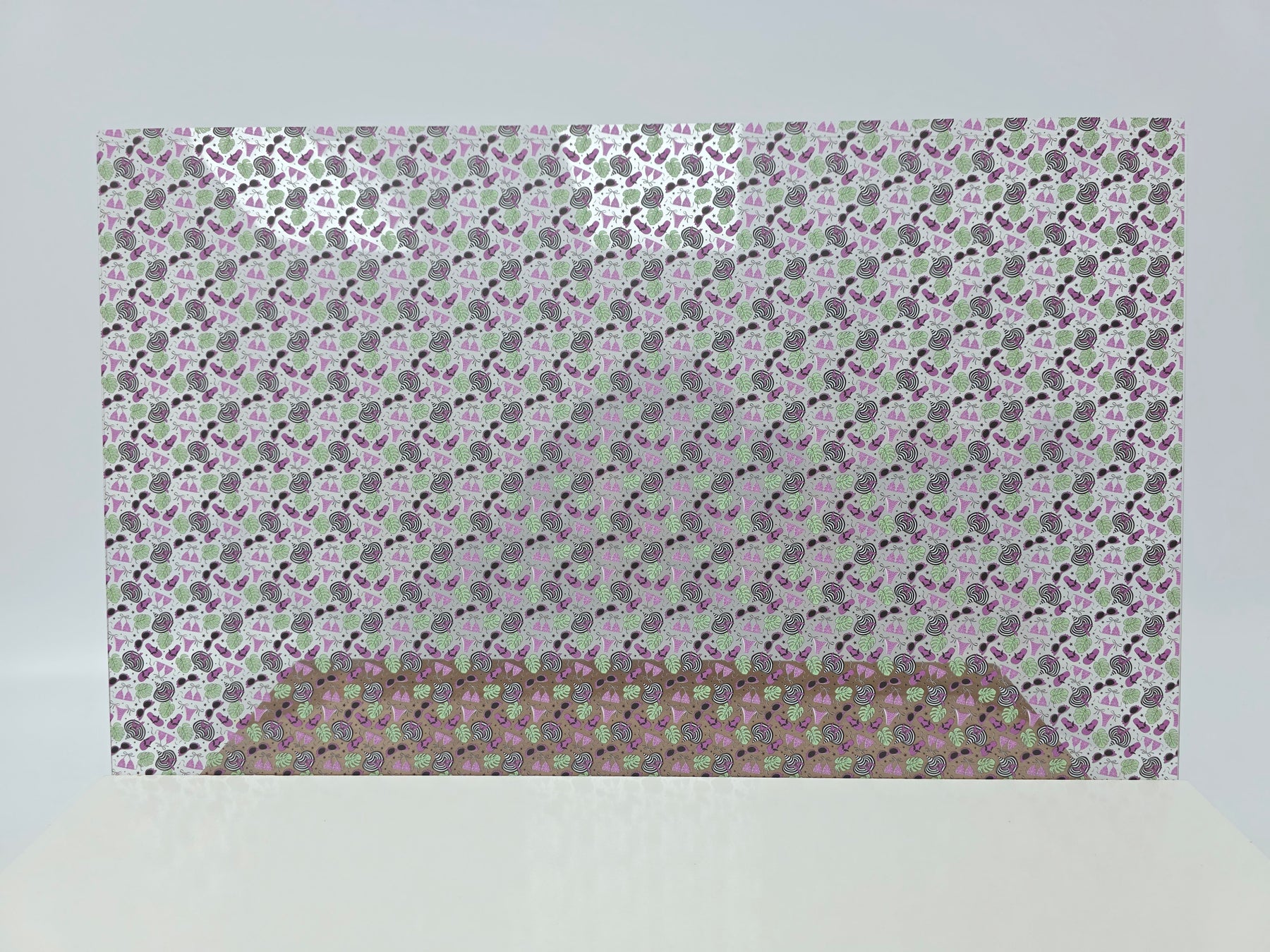 Scattered PatternPly® patterns contain gaps or breaks through which the core material is visible. For example, a scattered heart pattern on clear acrylic core will have clear acrylic showing through between the hearts. The same pattern on black acrylic will be black in between the hearts. The amount of core material showing will vary from pattern to pattern; some patterns contain large gaps between the pattern elements, while others are much closer together.